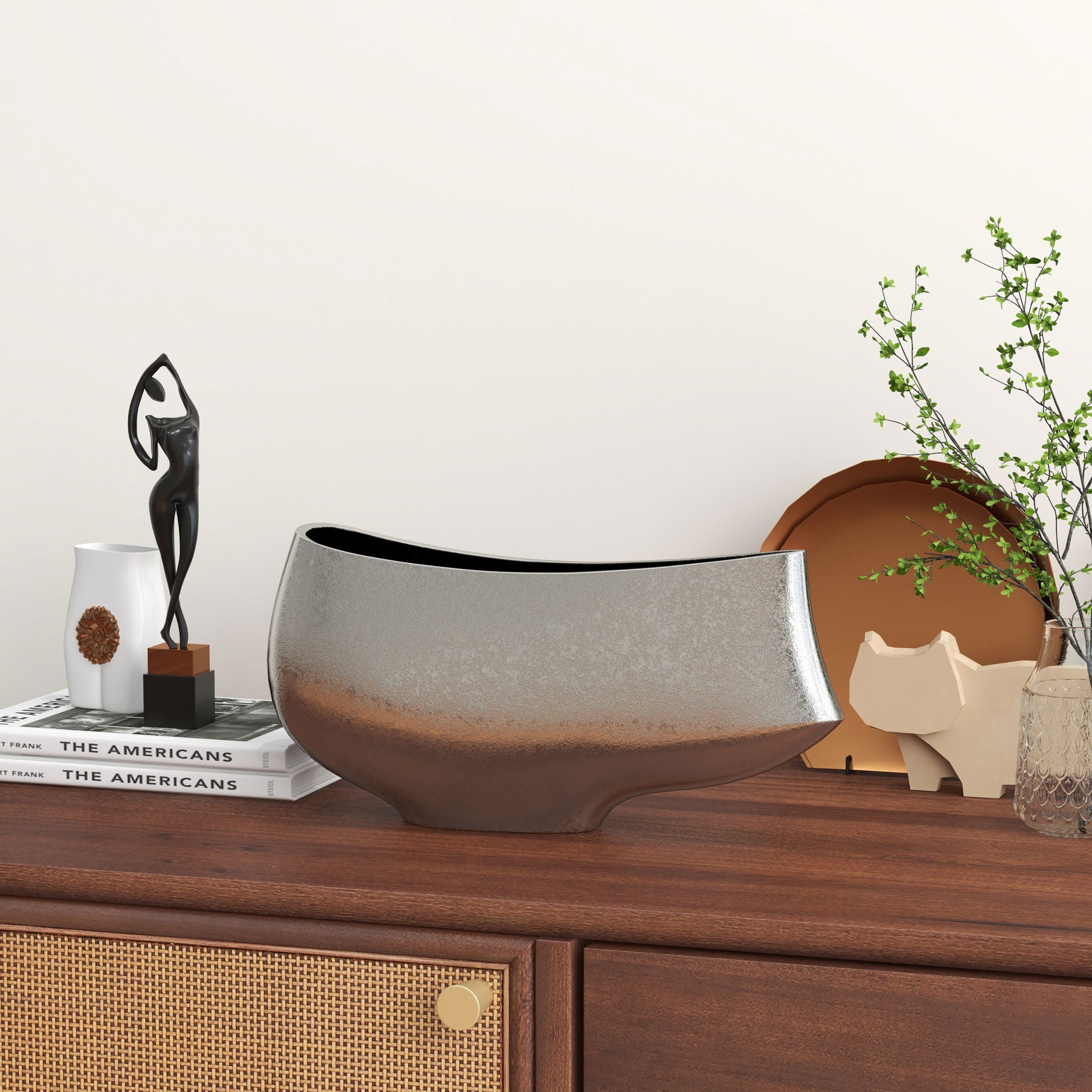 The 7-inch nickel aluminum table vase is an elegant centerpiece that blends modern style with purposeful design. Crafted from durable cast aluminum, this striking vase showcases a unique distressed metal finish, adding character to any room. The nickel color enhances its contemporary appeal, making it a versatile piece for both traditional and modern decors. Perfect for displaying fresh flowers or as a standalone accent, this table vase effortlessly elevates your home aesthetic. Its compact size makes it an ideal choice for coffee tables, shelves, or entryway consoles, providing a touch of sophistication without overwhelming your space. Enhance your living area with this exquisite vase that combines functionality and style seamlessly. 6.8-inch h x 13.7-inch w x 4.1-inch d.
